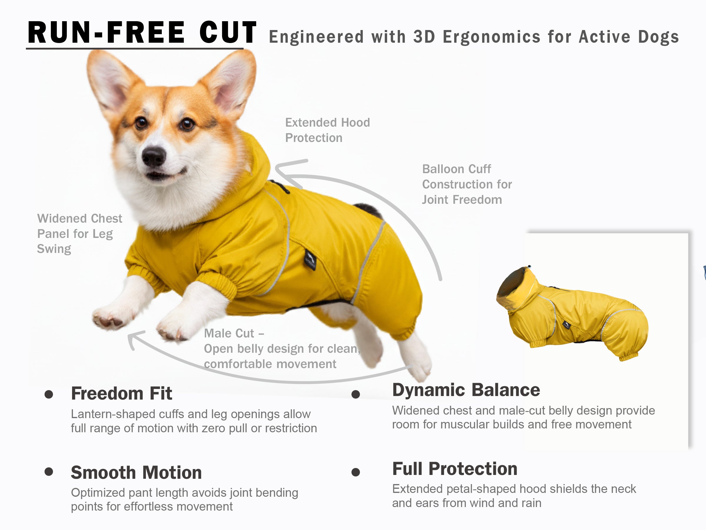 The Run-Free design eliminates common fit issues seen with standard dog coats, offering a secure yet flexible fit that adapts to the Corgi’s energetic gait and low-to-the-ground stature.