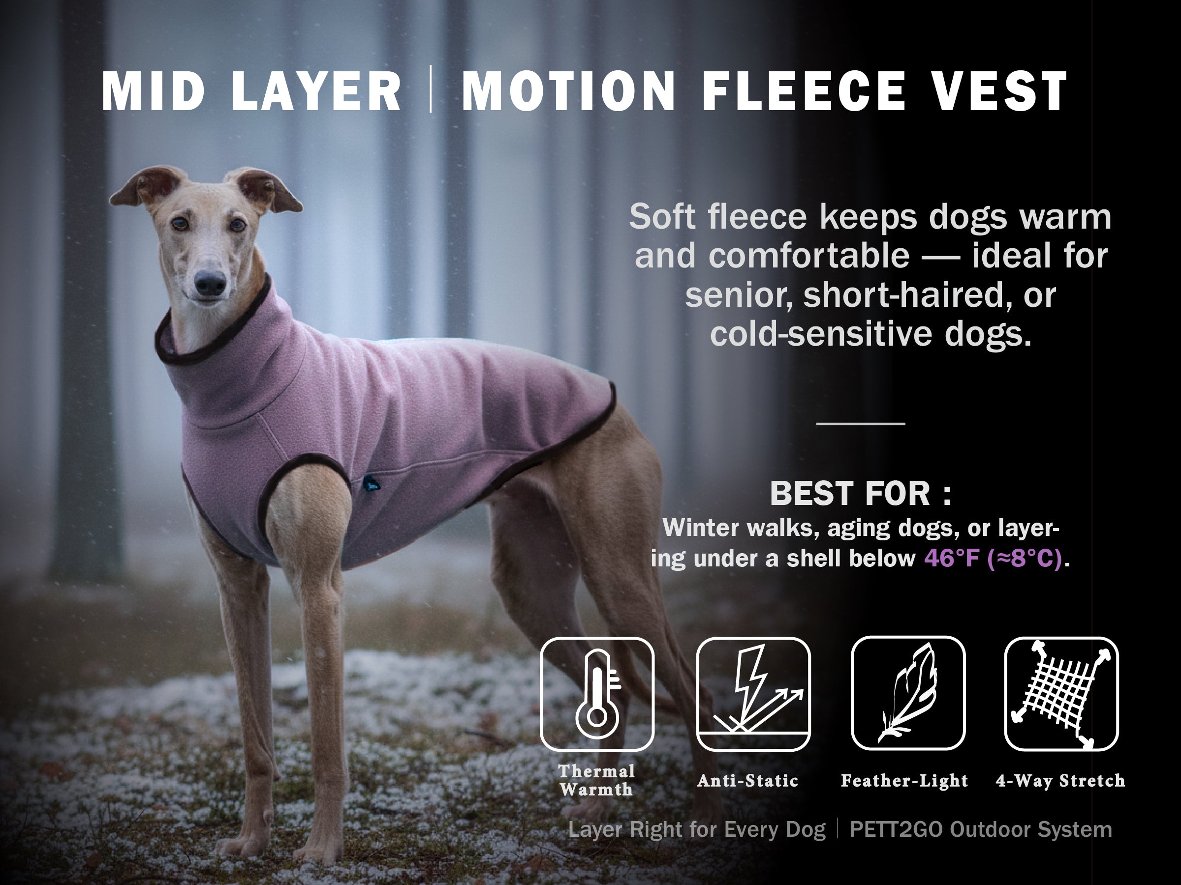 The Motion Fleece Vest combines thermal comfort, 4-way stretch freedom, and a body-hugging ergonomic design so dogs can stay warm without feeling restricted.