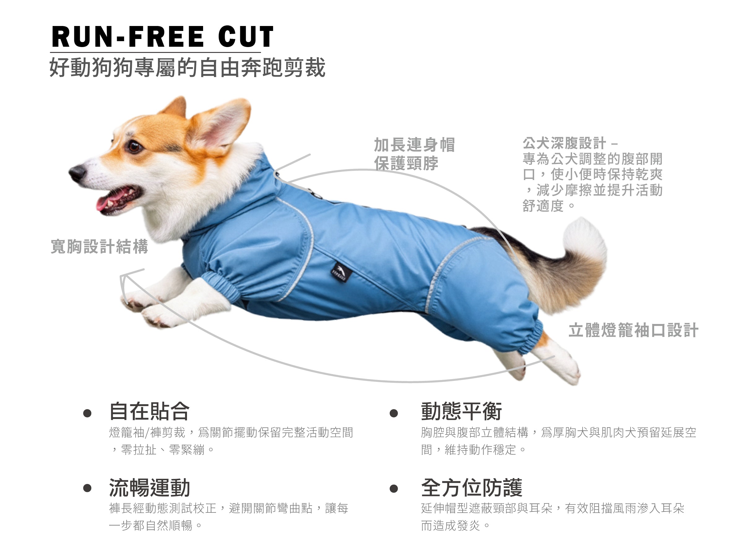 - 面料手感柔軟可四向伸展,讓狗狗在潮濕天氣也能舒適活動。