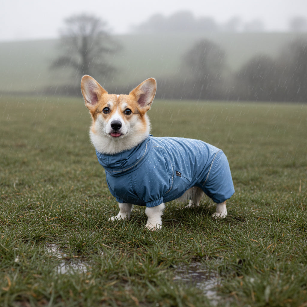 這款專為柯基設計的防水雨衣,符合柯基獨特體型,適合中小型犬。採用2.5層防水透氣面料,具備優異的防水等級(10,000mm)與透氣性(MVTR 20,000 g/m²/24h),可在雨中保持乾爽達5–6小時。