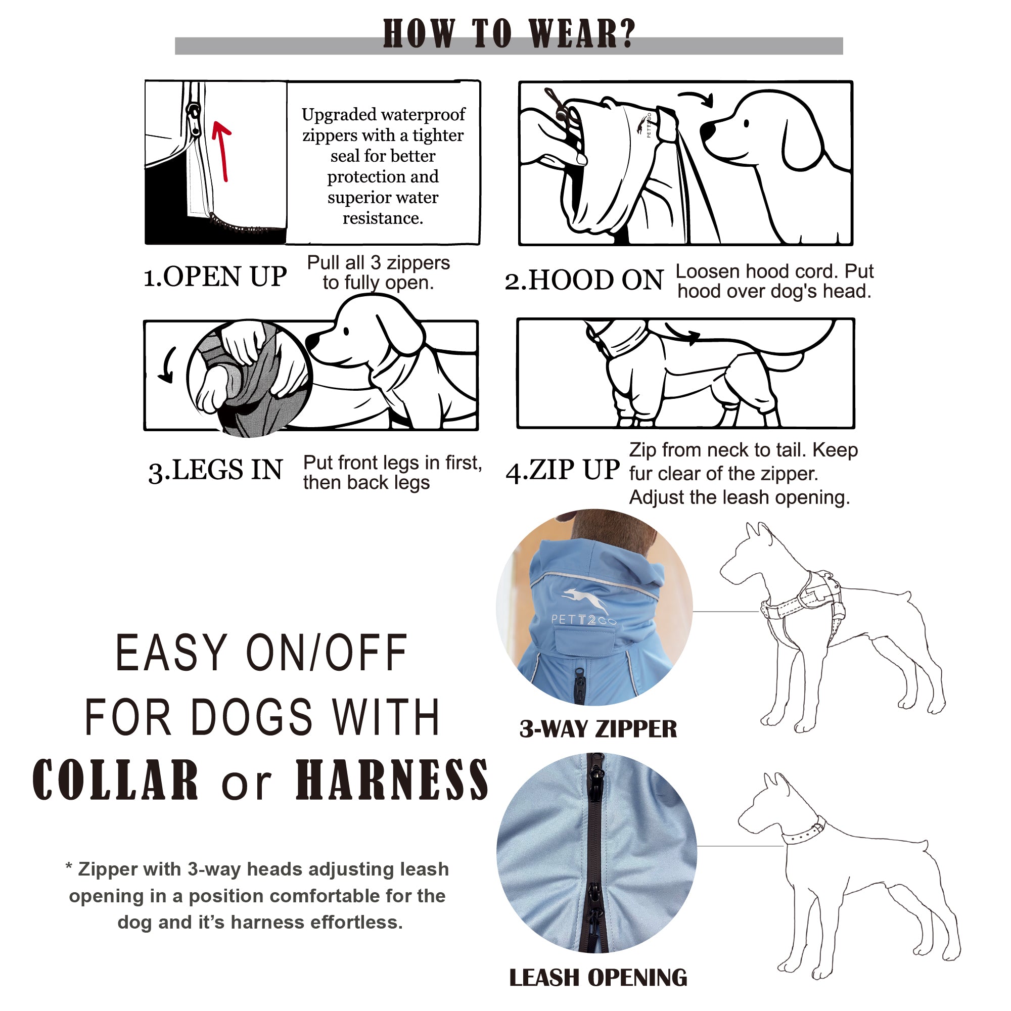 - 3-way waterproof zipper adjusting leash opening in a position comfortable for the dog and it’s harness effortless.