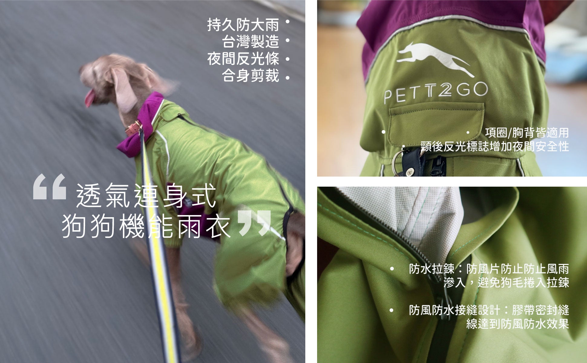 - 狗雨衣縫有3M反光條,並使用明亮的對比色,在低光和惡劣天氣條件下提高可見度和安全性。
