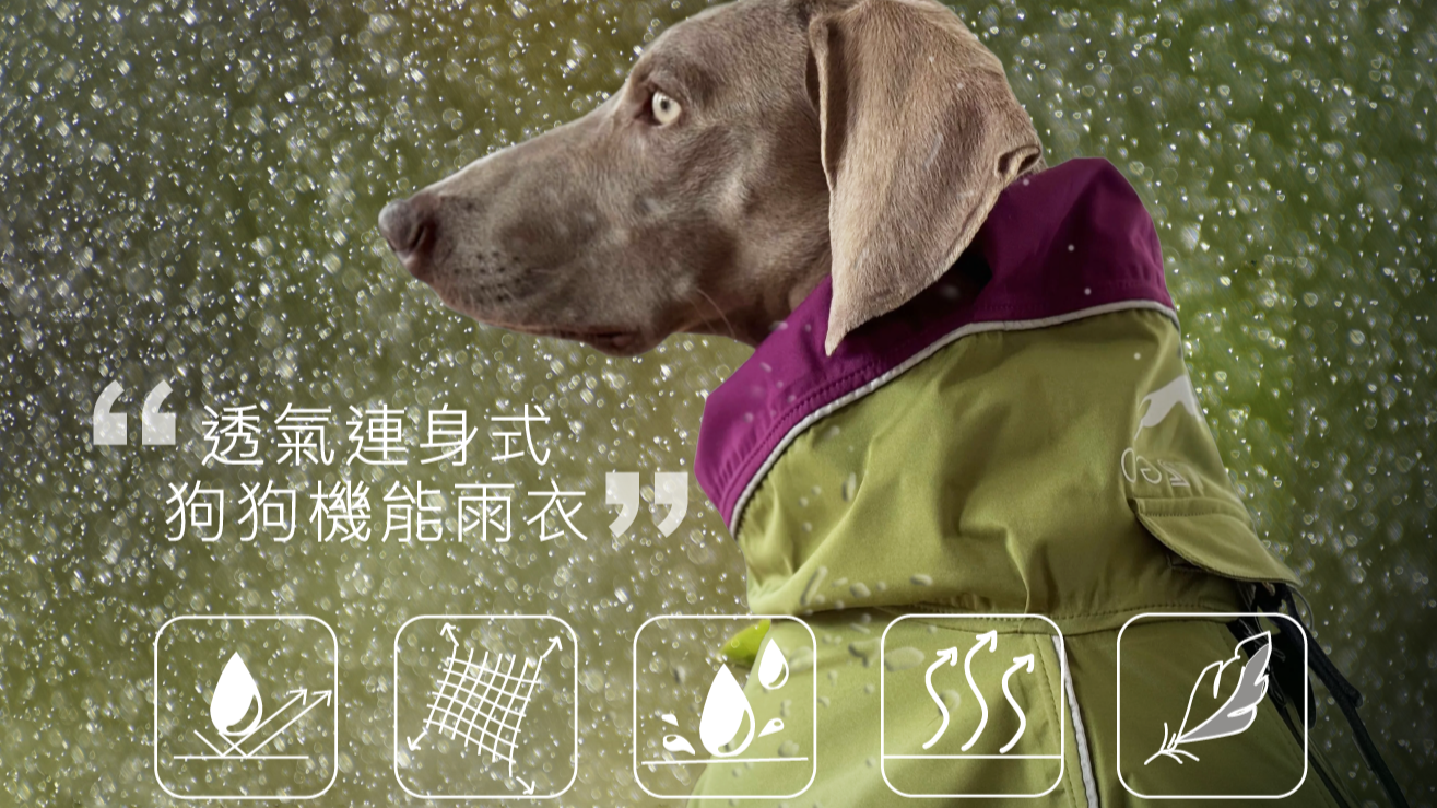 明亮的對比色設計提升了狗狗在雨中的可見度,2.5層的面料結構在具備優異的透氣性(MVTR 20,000 g/m²/24小時)和防水等級(10,000毫米)性能還輕便易攜帶,讓精力旺盛的狗狗在壞天氣也能時刻保持乾爽和舒適。