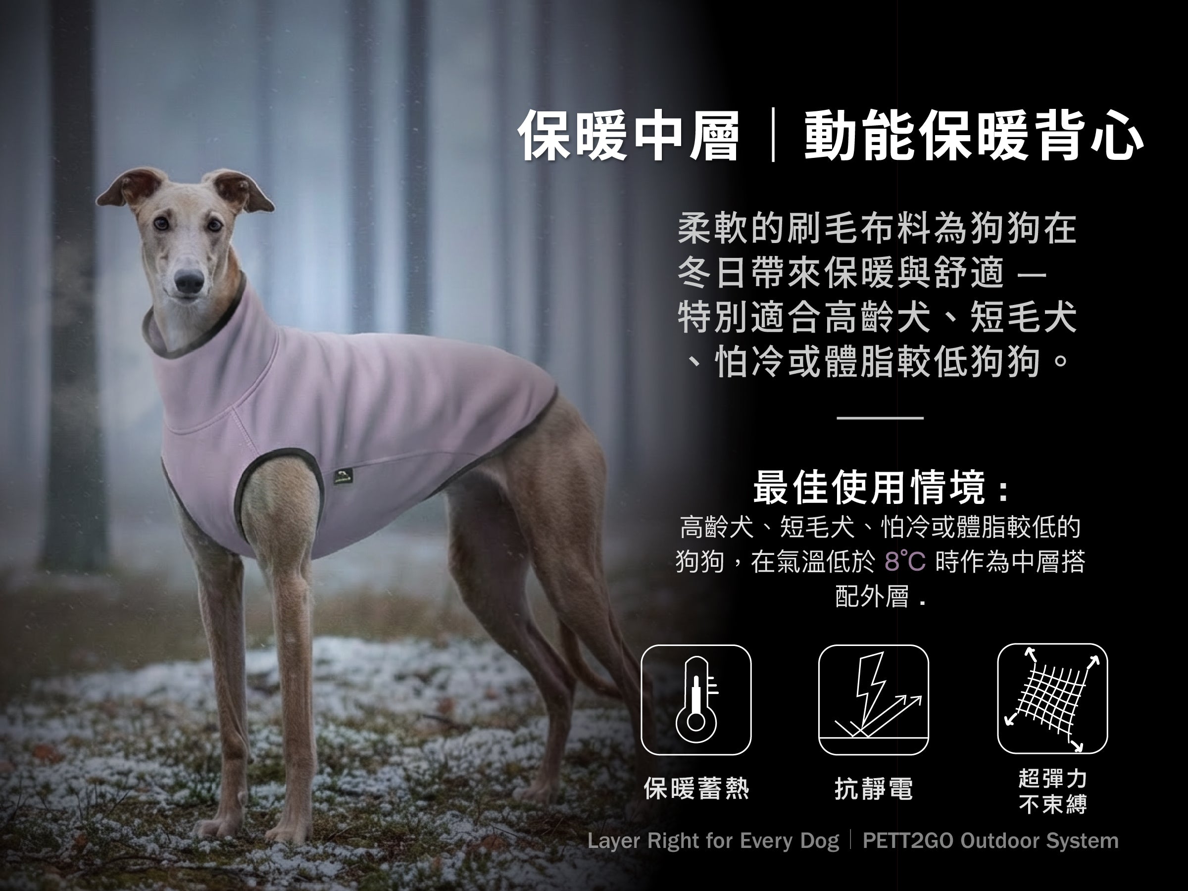 動能保暖背心結合了蓄熱保暖、四向彈力與貼合身形的工學剪裁,讓狗狗在寒冷天氣中保持溫暖,同時不受束縛。