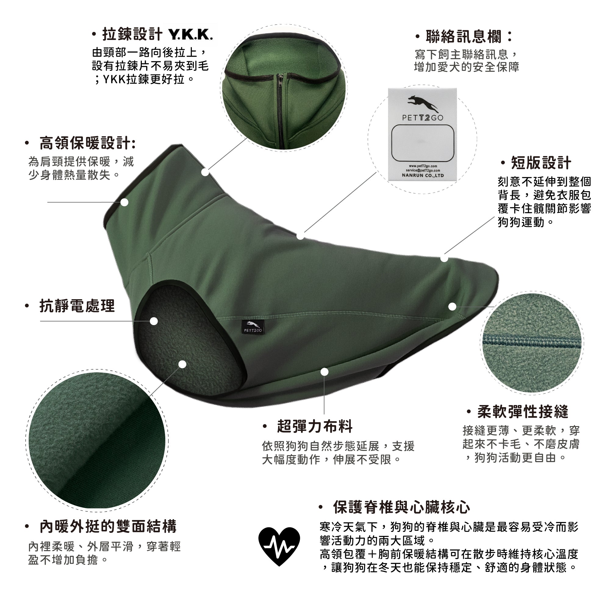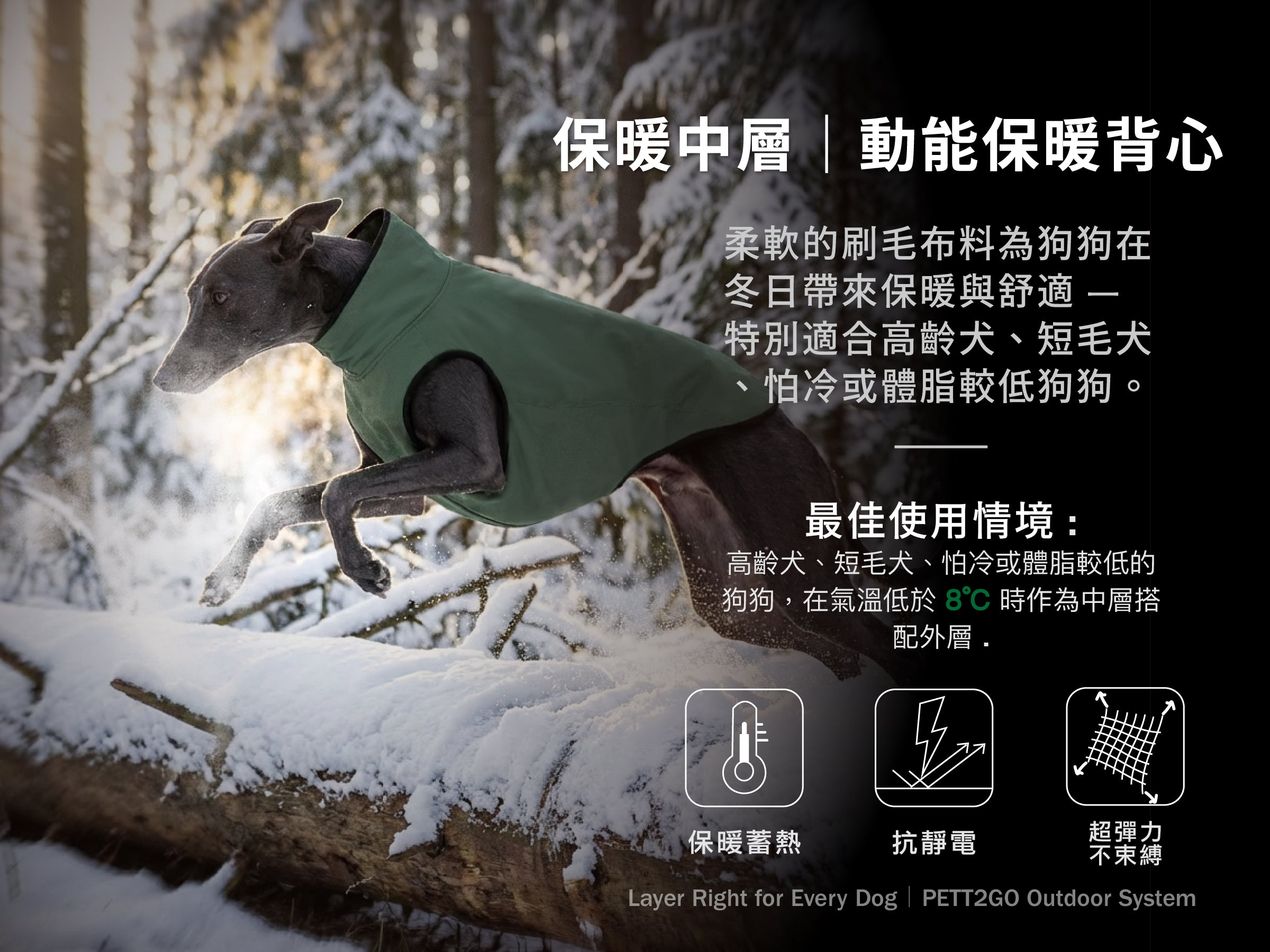 動能保暖背心結合了蓄熱保暖、四向彈力與貼合身形的工學剪裁,讓狗狗在寒冷天氣中保持溫暖,同時不受束縛。