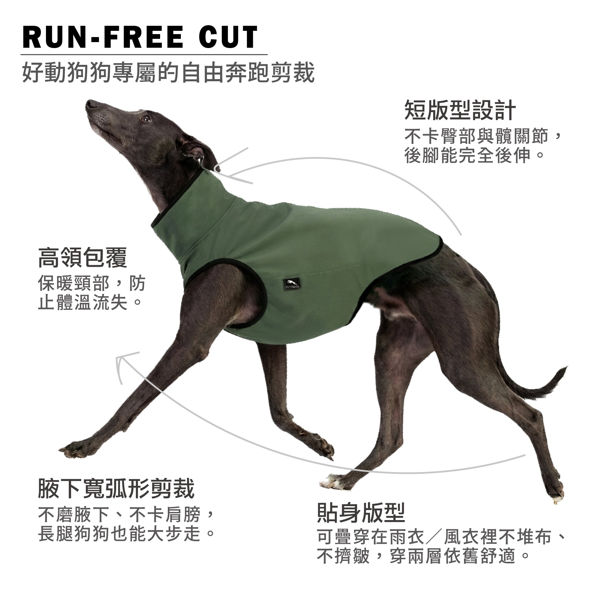 Motion Fleece Vest 結合 蓄熱保暖、四向彈性 與 Run-Free Cut 狗狗自由奔跑剪裁版型,