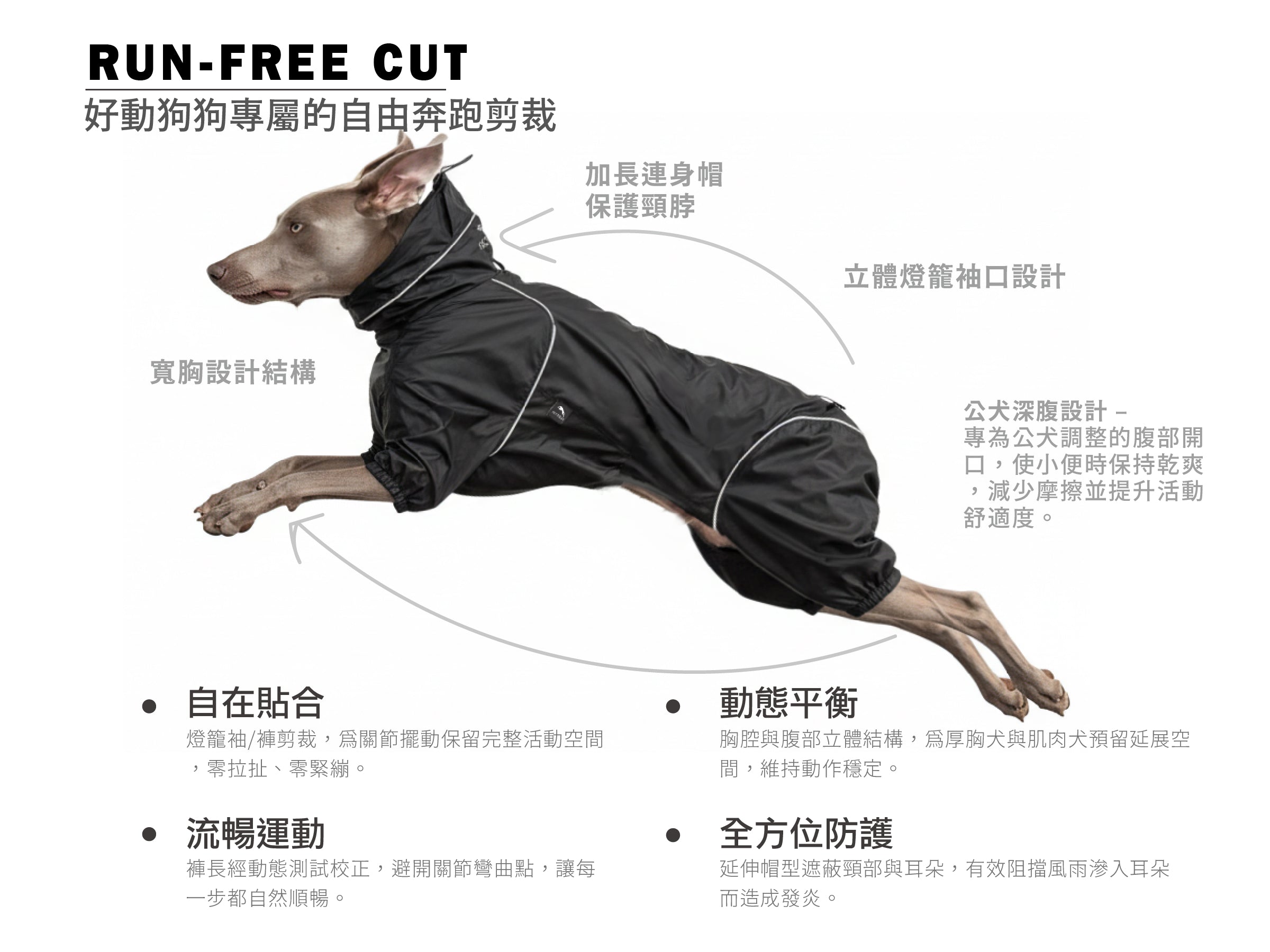 - 腿部設計和可調節的帽子,給予狗狗更多保護。