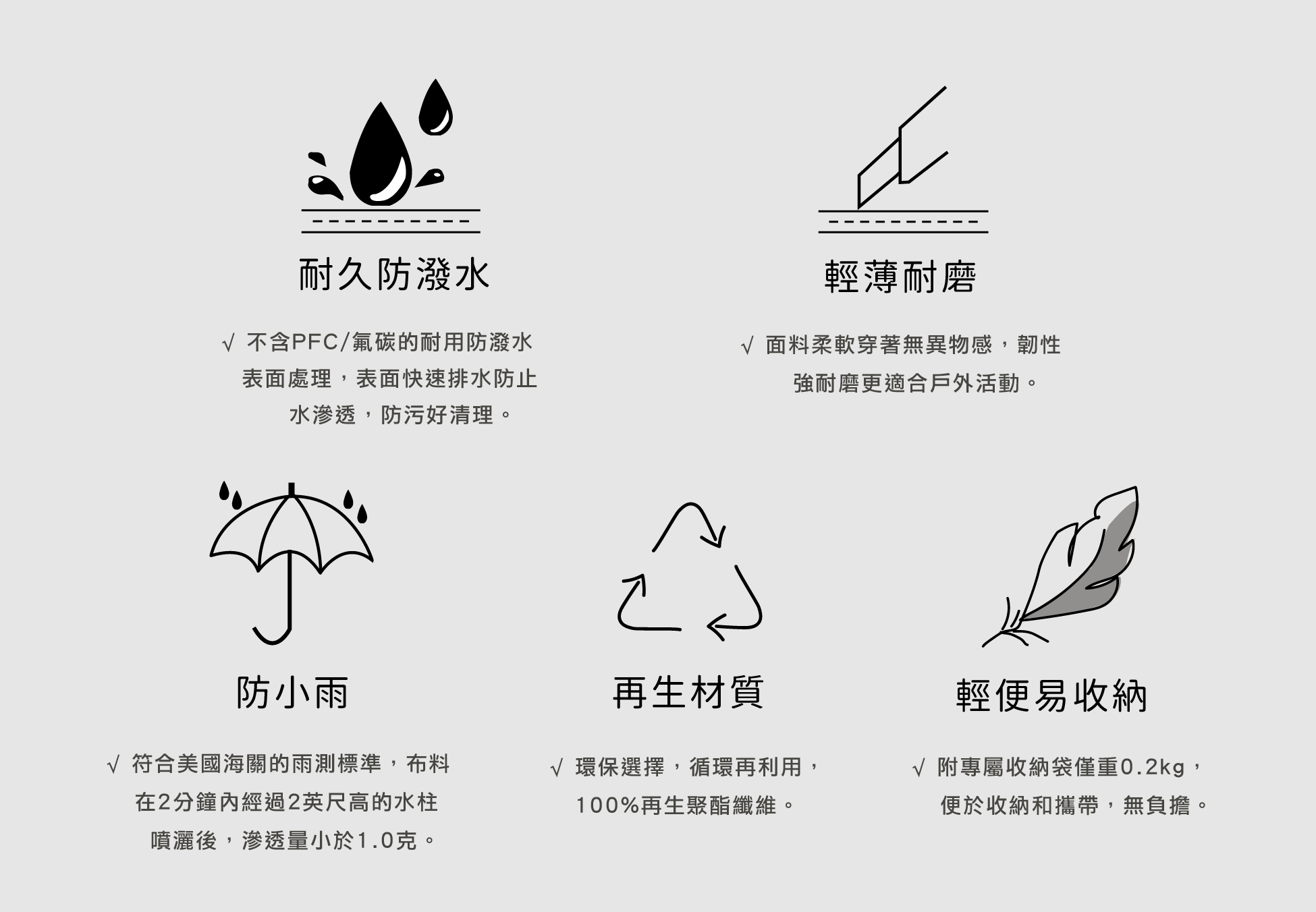 - 防風&超撥水 (DWR),通過小雨測試,輕薄耐磨。