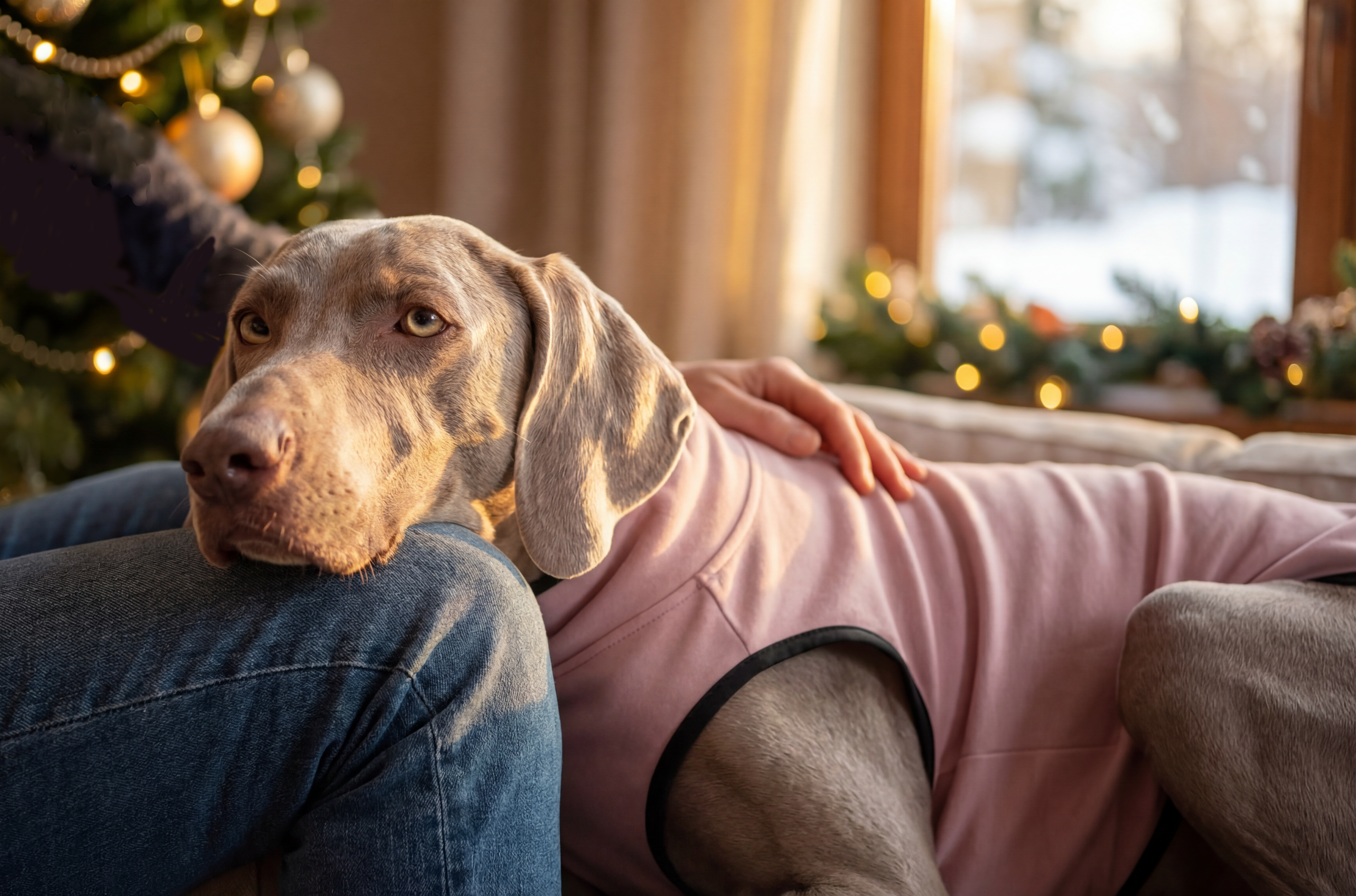 This dog sweater keeps my short-haired Weimaraner warm and comfortable. She wears it at home, and when it’s time to go out, I just put on her collar and we’re good to go.