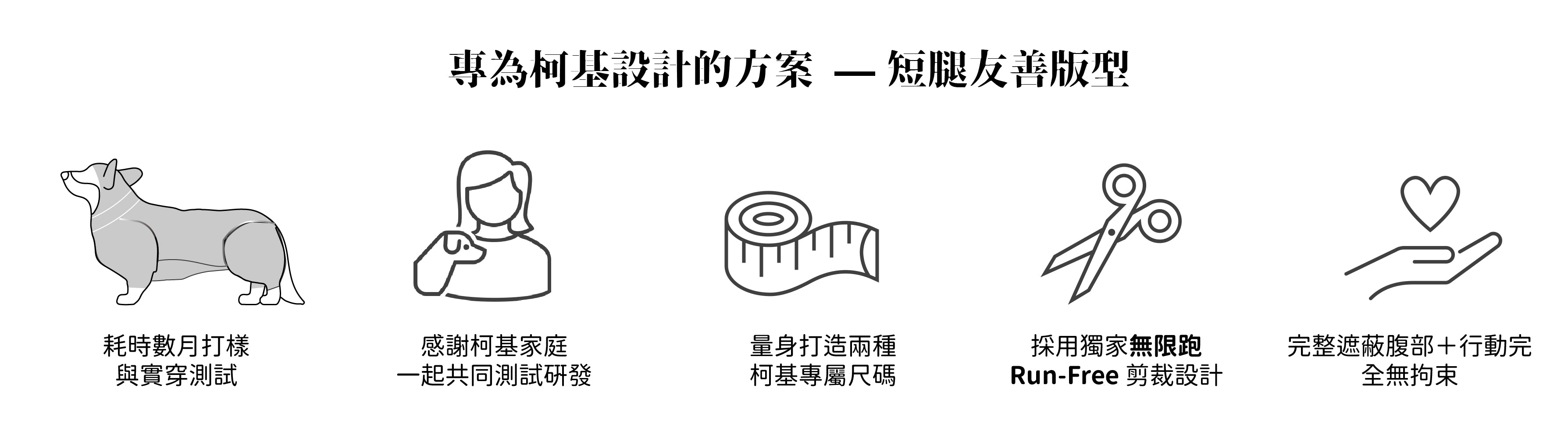 這款雨衣是專為柯基犬獨特的身形比例量身打造——包含寬厚的胸部、短短的腿以及偏長的身體。由 PETT2GO 設計的創新剪裁技術 Run-Free Cut,在前腿處採用縮短的褲長設計,並加深胸部的寬度,隨後收緊腹部的布打造出立體弧形曲線,讓衣服穿起來整體更加貼合、不壓迫,提供柯基最大的活動自由度。