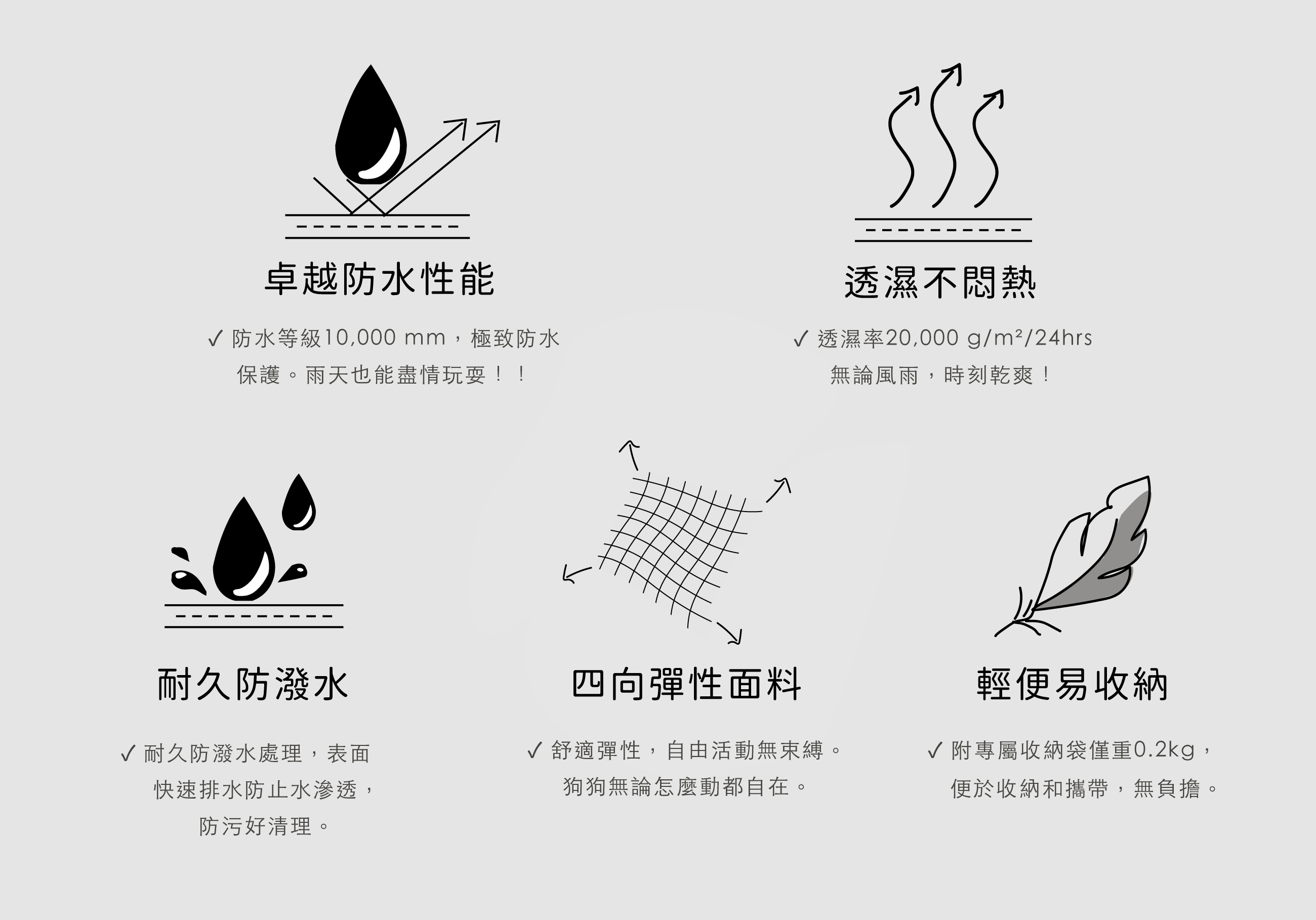 - 防風、防水且透氣,排出雨衣內多餘的熱氣和濕氣,在防雨水的同時避免了狗狗在悶濕環境中發生皮膚病。
