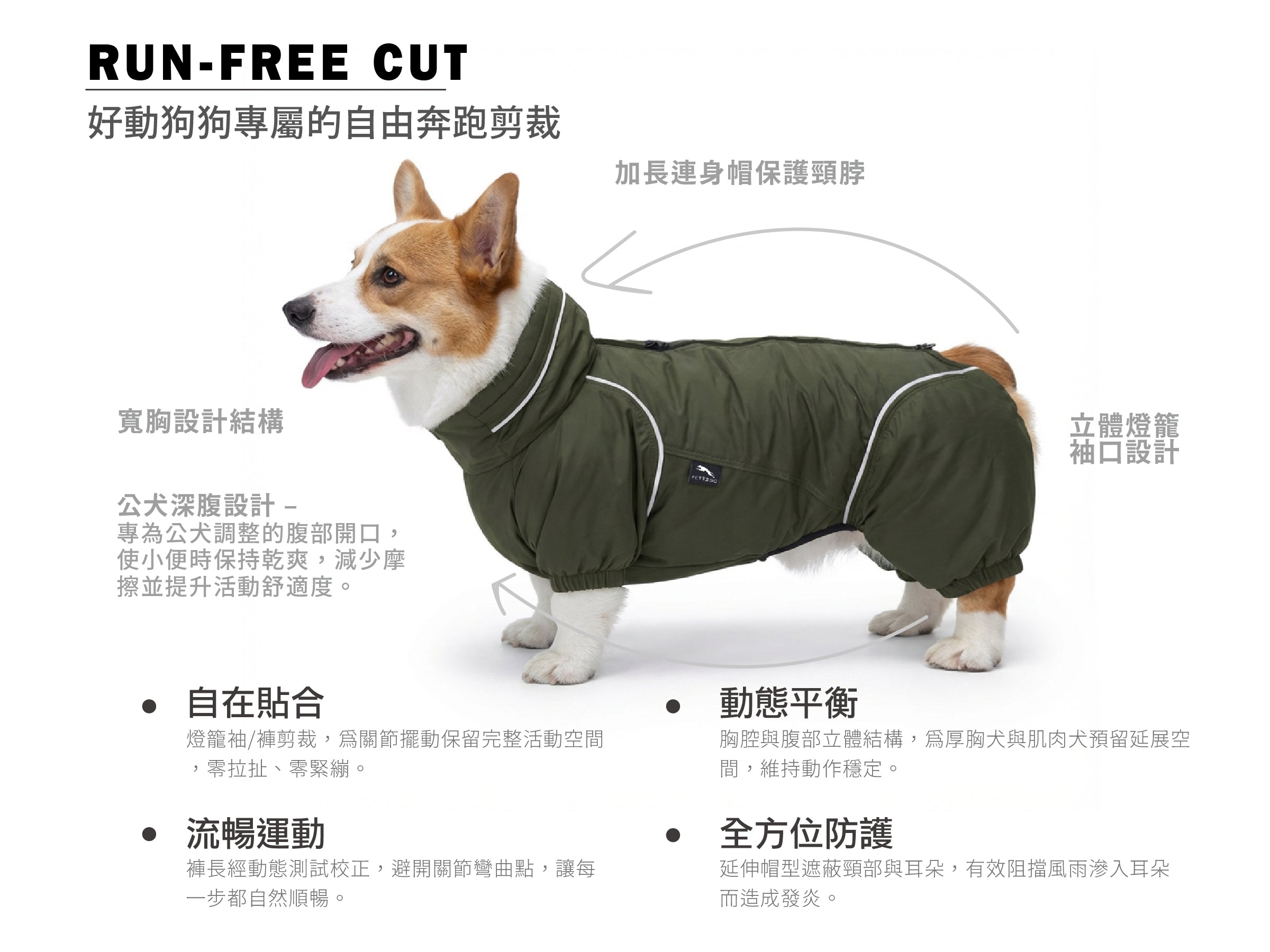 - 連身式的剪裁包覆住狗狗70%的皮膚,阻擋了戶外的蚊蟲和異物穿刺的危險,拉鍊式設計方方便狗狗穿脫。