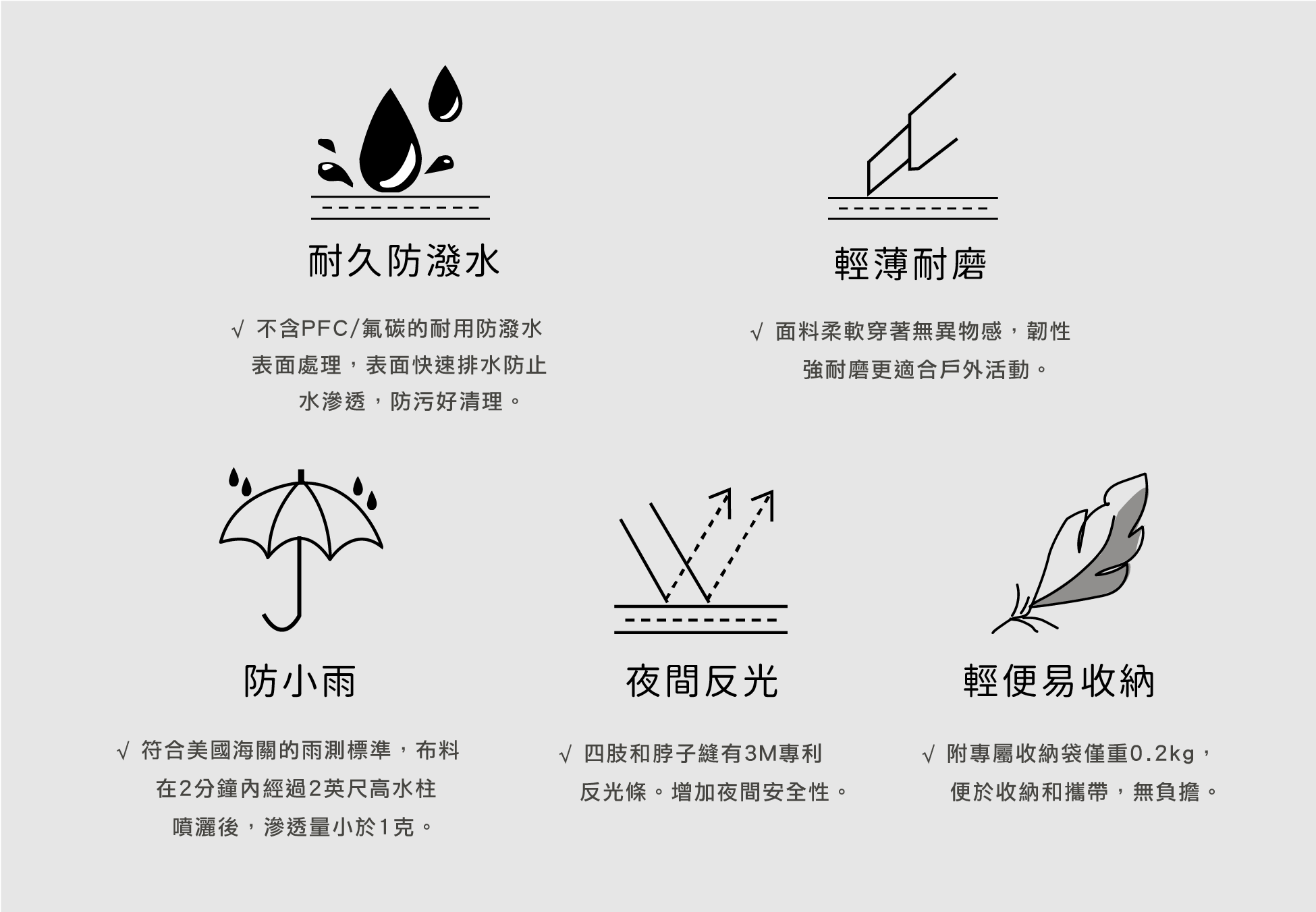 - 防風&超撥水(DWR),通過小雨測試,輕薄耐磨。